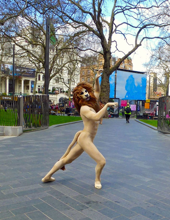 Die Spaziergang-Tiere posieren für Fotos und können ihren Tierkostümen humorvolle menschliche Kleidung hinzufügen. Sie sind vielseitig und komisch, aber auch athletisch und beeindruckend. Es ist nicht oft, dass man einen Gepard sieht, der eine Krawatte und eine Jacke trägt und die Sonntagszeitung liest, aber mit dieser kitschigen Wander-Performance ist alles möglich.