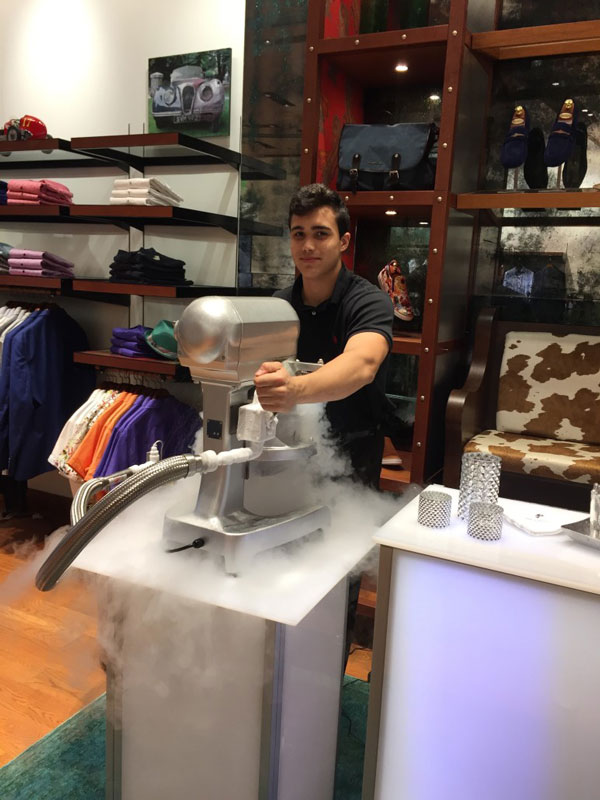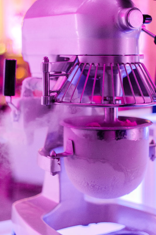 Unsere ausgeklügelte Maschine verwandelt jede traditionelle Rührschüssel in einen Nebelbrunnen, der in der Luft verdunstet und die Menschen fragen lässt, wie das Magie passiert ist. Alle Aromen der frischen und natürlichen Zutaten werden durch diesen außergewöhnlichen Prozess mit flüssigem Stickstoff intensiviert.