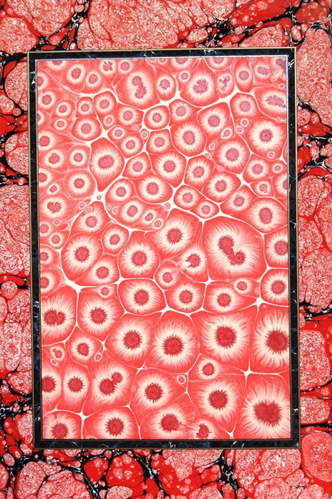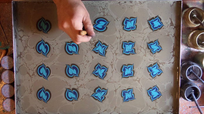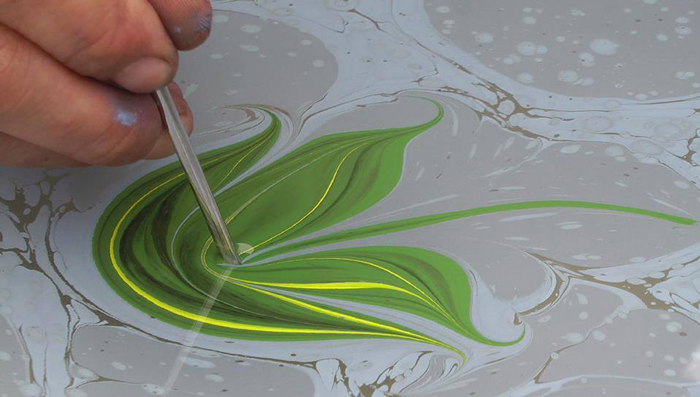 Jedes Stück Papiermarmorierungskunst ist völlig einzigartig und unser hochqualifizierter Künstler kann sowohl faszinierende Muster als auch tatsächliche Darstellungen von Objekten wie Blumen erstellen. Er kann maßgeschneiderte traditionelle Kunstwerke speziell für Sie und Ihre Gäste erstellen.