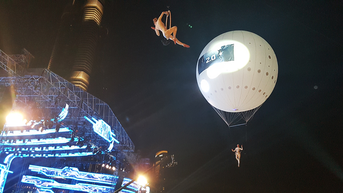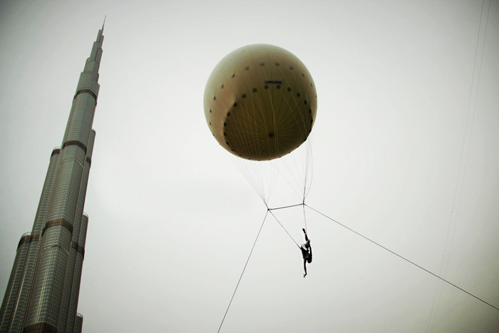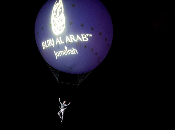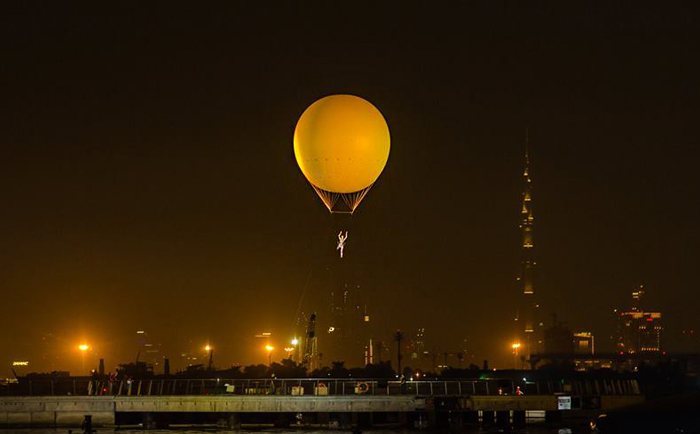 Die Helium-Ballon-Show umfasst ambiente Luftakrobatik, während sie an einem riesigen schwebenden Helium-Ballon hängt, begleitet von Musik und Beleuchtung. Die UAE Helium-Ballon-Luftshow bietet die Möglichkeit eines oder mehrerer Künstler, sodass Sie eine extravagante Show am Himmel kreieren können.