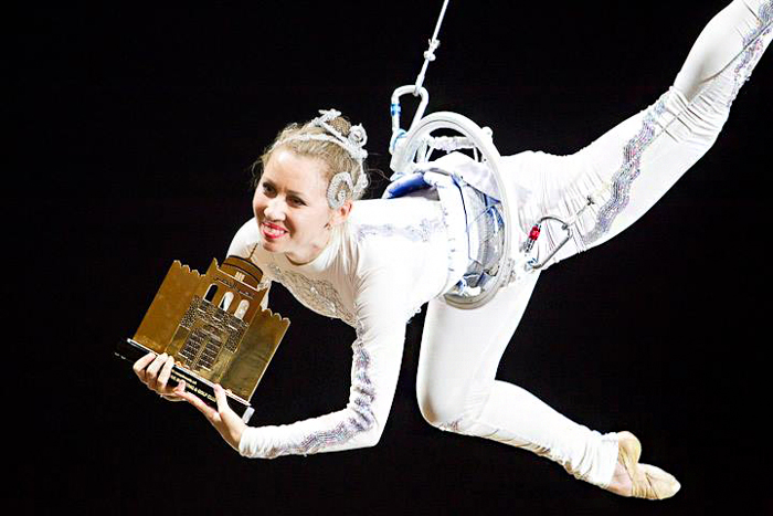 Die Luftakrobatik wird mit größter Raffinesse durchgeführt und ist ein visuelles Vergnügen. Sie sind in anpassbaren Ganzkörperanzügen oder LED-Kostümen gekleidet und können eine Vielzahl von Requisiten verwenden, darunter ein Luftgeschirr, Cor de Volan, Seide, Luftreifen oder LED-Luftreifen.