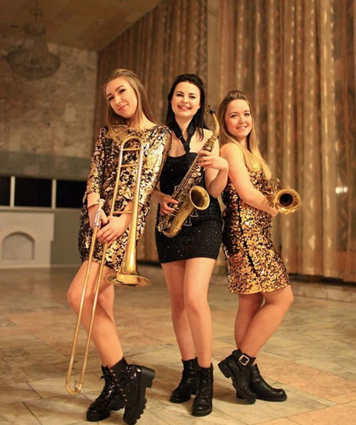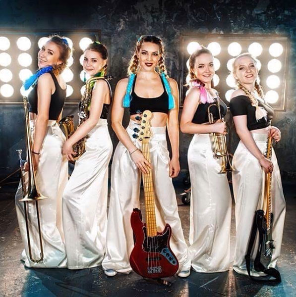 Die sehr stilvolle Ukraine All Girl Party Band kann sich vollständig dem Anlass entsprechend kleiden. Sie haben eine Auswahl an glamourösen Outfits, auffälligen weißen Anzügen und lässigen Stilen, die alle je nach Veranstaltung anpassbar sind. Die ausschließlich weibliche Band stammt aus Kiew und besteht aus professionellen und talentierten Musikerinnen. Die Besetzung besteht aus Gitarre, Bass und einer Bläsersektion. Die ungewöhnliche Instrumentierung führt zu einem Live-Musikstil, der einzigartig für diese ausschließlich weibliche Band ist.