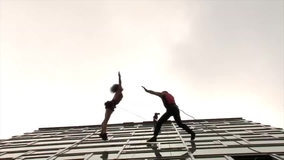 Brechen die Konventionen von akrobatischen Shows, diese geschickten Gebäudewanderer kreieren imaginative Shows an den Fassaden von Gebäuden.