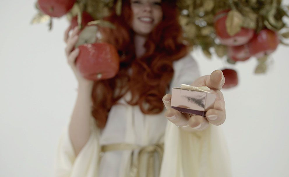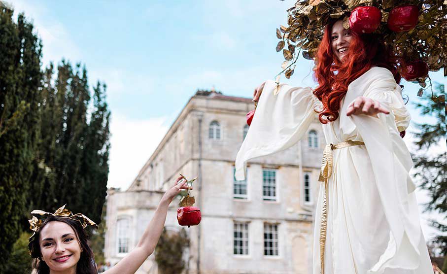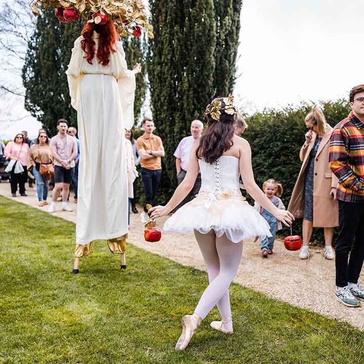 Sie bewegt sich unter Ihren Gästen und nimmt ihre Äpfel weg, die alles enthalten können, von Schokoladensüßigkeiten über Gedichte und Ratschläge bis hin zu Puzzlestücken.