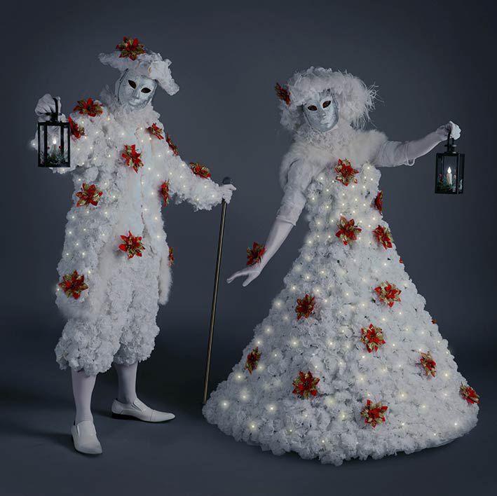 Ihre Kostüme werden von funkelnden LED-Lichtern beleuchtet und können Weihnachtsstern- und Stechpalmenverzierungen enthalten, für eine zusätzliche weihnachtliche Note.