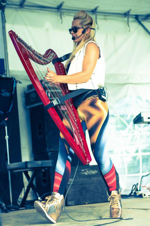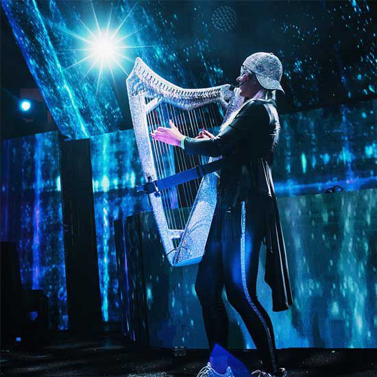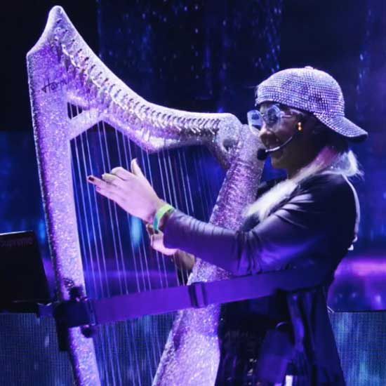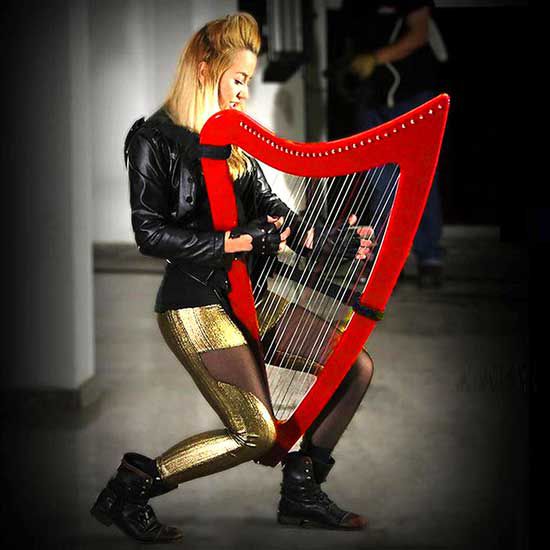 Diese äußerst talentierte Musikerin ist einzigartig, revolutionär und aktuell in der heutigen Musikindustrie. Sie bietet ein neues Erlebnis für alle Zuschauer, die die Harfe in diesem neuen Klang noch nicht erlebt haben. Unsere Musikerin erzeugt nicht nur einen neuen und innovativen Klang, sondern lässt die Harfe auch wie ein völlig neues Instrument aussehen, indem sie sie um ihre Taille schnallt und wie eine Gitarre spielt. Dadurch entsteht ein viel dynamischeres Erscheinungsbild und es wird Platz gespart!