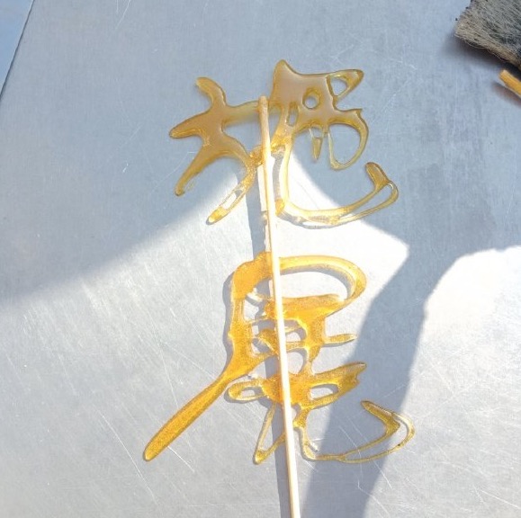 Wenn die Figur fertiggestellt ist, wird ein dünner Holzstab, der zum Halten der Figur verwendet wird, an zwei oder mehr Stellen mit weiterem Zucker befestigt. Eine Unterhaltungsoption, die von Kindern geliebt wird, werden diese köstlichen Zuckerfiguren während Ihrer Veranstaltung bei den Kindern für lange Schlangen sorgen!