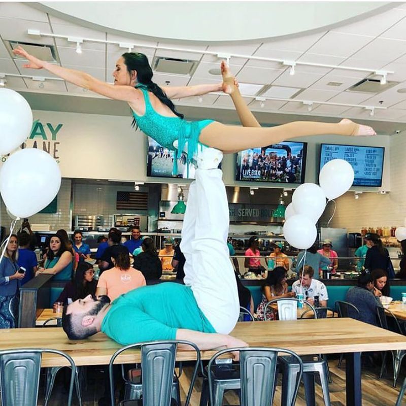 Un grupo altamente talentoso de acróbatas realiza equilibrio de manos a manos, contrapeso y coreografía de adagio.
