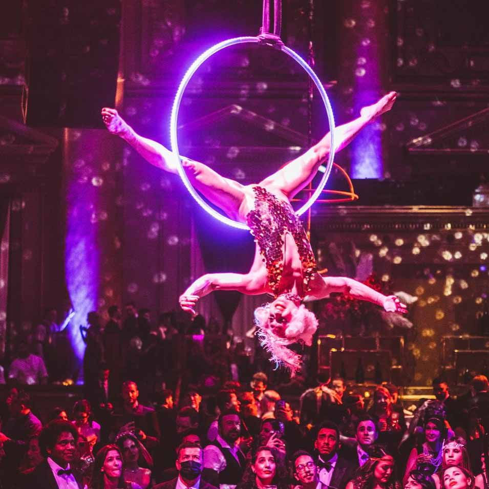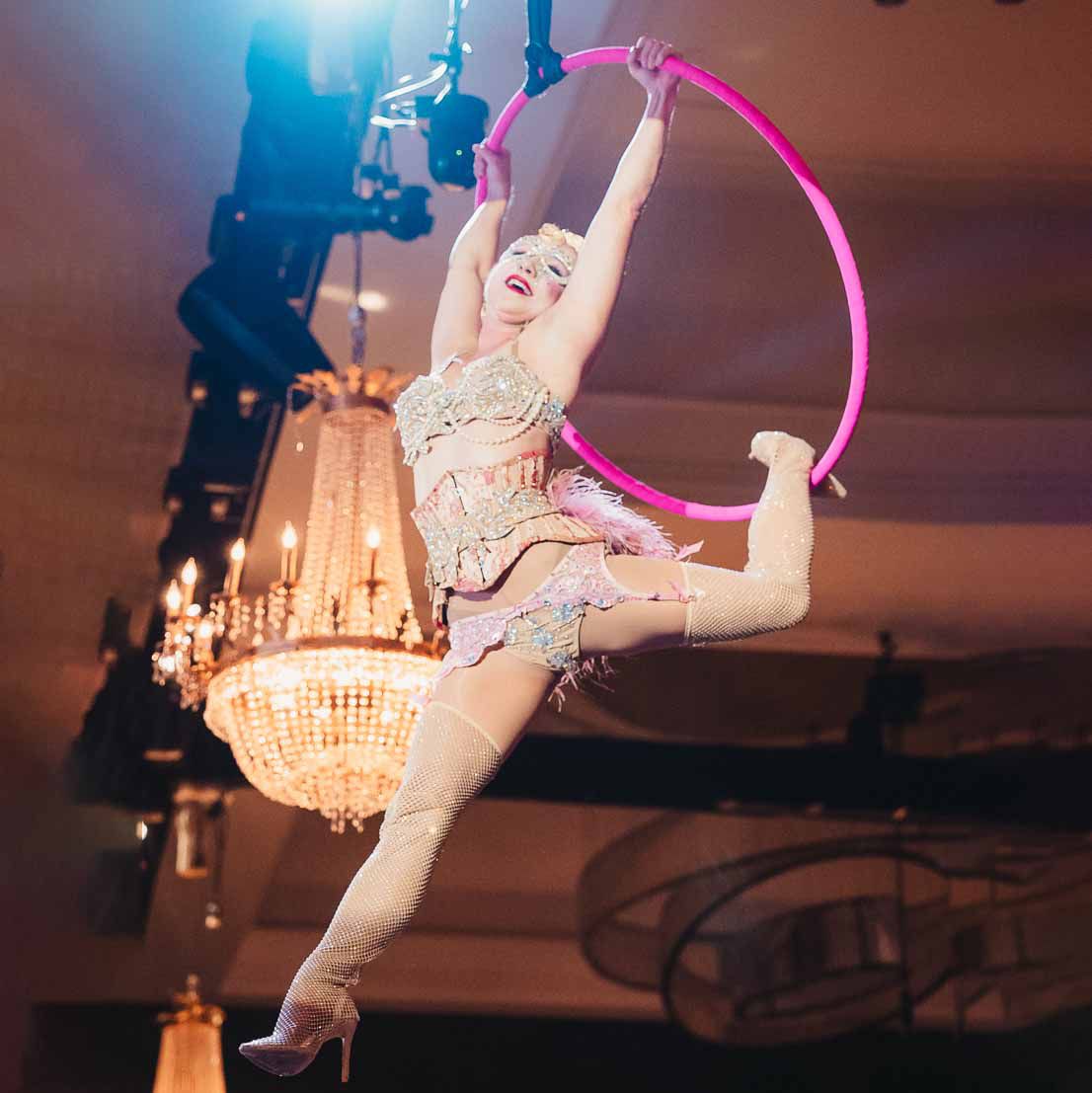 Nuestra hermosa soprano canta en directo en el aire sobre un aro aéreo, una luna, sedas y un mástil aéreo, a menudo sin amplificación, creando un ambiente maravilloso