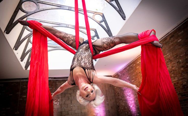 Si buscas algo más desenfadado, también ofrece números cómicos en el poste de la ópera, así como selecciones más movidas en el aro aéreo, según tus preferencias