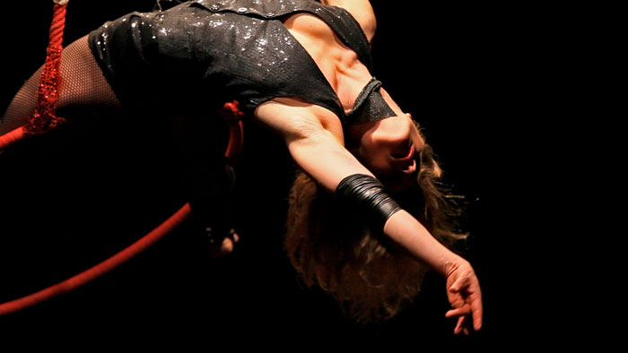 - Aro Aéreo: Utilizando un gran aro suspendido del techo, la acróbata aérea crea formas impactantes mientras se sienta en el centro o cuelga del aro.