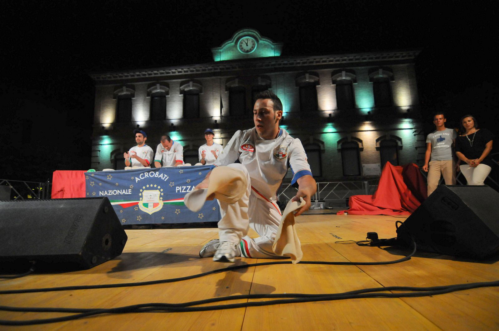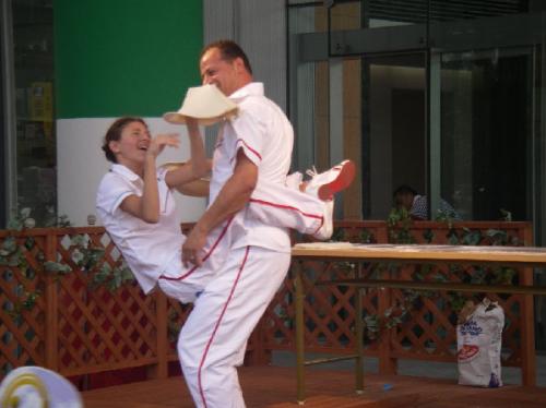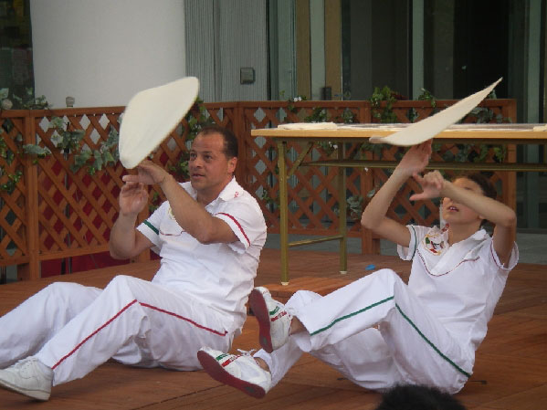 Los invitados verán con asombro cómo estos hacedores de pizza acrobáticos campeones mundiales lanzan, giran, dan vueltas y hacen malabares con múltiples bases de pizza en el aire. Combinando actuación, acrobacias, humor y catering, los hacedores de pizza acrobáticos realmente crean la elección definitiva de entretenimiento para cualquier evento. Llevando el juego de hacer pizza acrobática al mundo, desde Italia, hasta América y Japón.