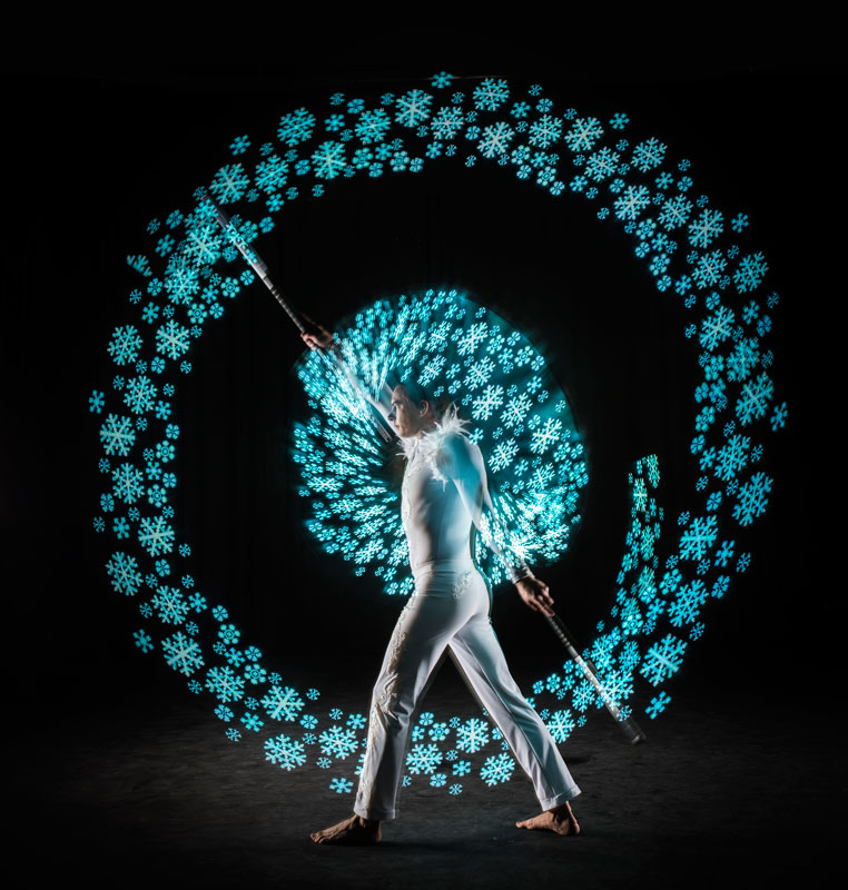 También disponibles como un acto de LED poi vestidos con trajes blancos intrincadamente diseñados con hermosos bordados y plumas blancas, esta opción funciona maravillosamente para cualquier evento temático de país de las maravillas invernal.