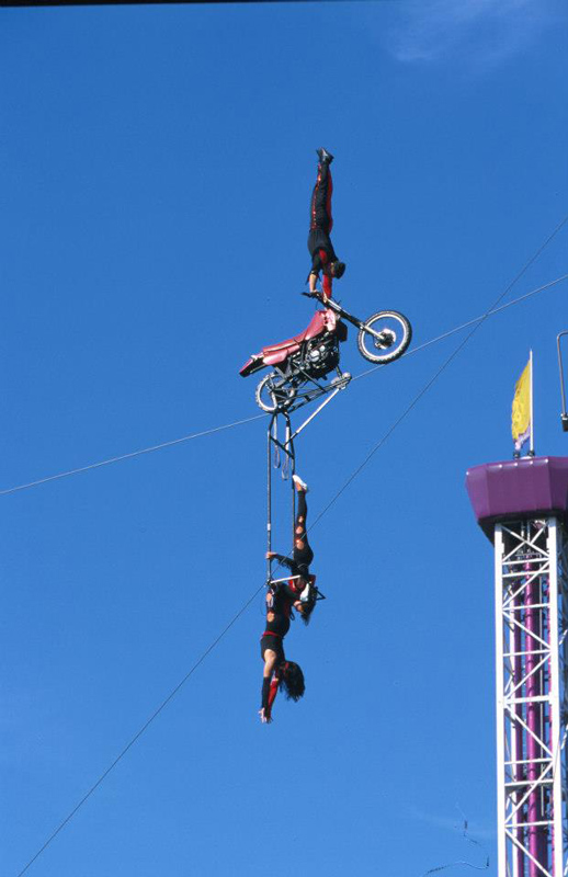 Apreciado por audiencias de todas las edades, este espectáculo fantástico es una mezcla espectacular de técnica impecable y valentía sobrehumana. Posándose orgullosamente en la silla de una motocicleta suspendida a 50 pies sobre el suelo en un delgado cable de metal, nuestros motociclistas acróbatas desafían las leyes de la gravedad con esta asombrosa actuación circense.