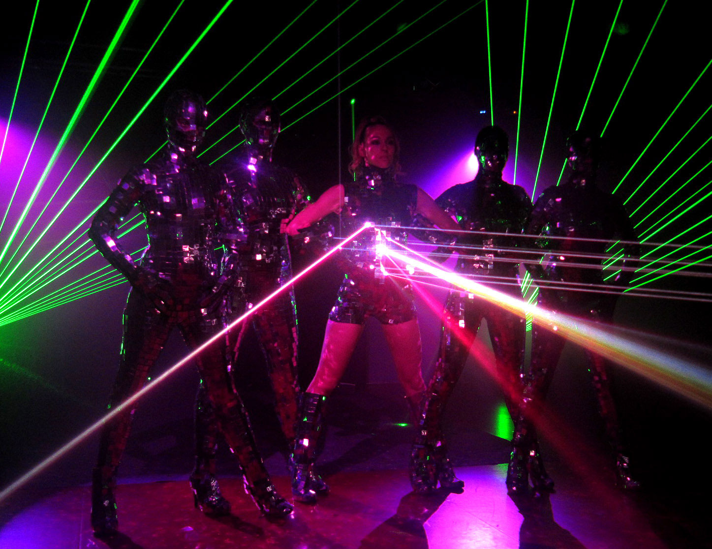 Este espectáculo es una mezcla perfecta de danza profesional y coreografía, láseres de colores y trajes de espejo, creando una actuación inolvidable que literalmente deslumbrará al público. Estos trajes de espejo personalizados se revelan poco a poco con efectos de luz, construyendo un crescendo de miles de destellos de luz de colores que crea un espectáculo único.