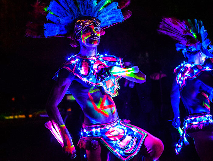 Adecuado para eventos tanto en interiores como en exteriores, el Acto de Paseo Tribal Azteca cobra vida cuando el sol se pone y ellos iluminan la oscuridad. El acto tribal lleva pintura corporal UV, ilumina sus trajes con luces y utiliza una variedad de accesorios LED.