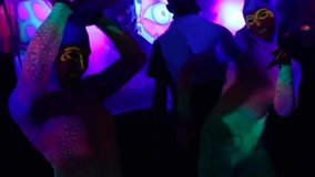 El Acto Psicodélico UV itinerante es ideal para interactuar con el público. Los personajes extraños se mueven a través de la danza y habilidades acrobáticas, creando todo tipo de formas extrañas y maravillosas a medida que pasan. El acto UV itinerante también interactúa y responde a la reacción de las personas que los rodean.