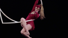 Una rutina aérea encantadora, realizada en una estructura especializada en forma de corazón aéreo, diseñada por un artista circense multidisciplinario y especialista en acrobacias aéreas.