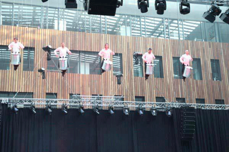 Con la capacidad de actuar en fachadas de edificios, estadios y arenas, salones de eventos y más, esta exquisita actuación hace que cada espectador mire al cielo y disfrute plenamente de la actuación de música en vivo desde arriba. Perfecto para eventos corporativos, funciones privadas, eventos deportivos y inauguraciones - estos destacados bateristas son la elección definitiva para el entretenimiento de eventos.