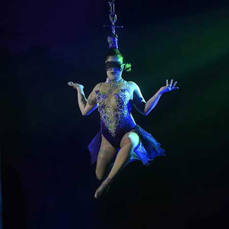 Suspendida por su cabello, nuestra Aerialista de Hair Hang se desliza por el aire mostrando sus increíbles habilidades acrobáticas.