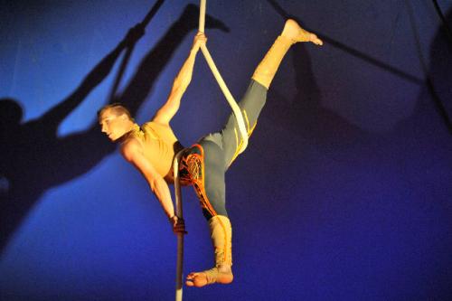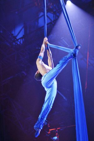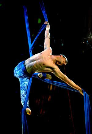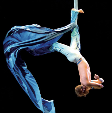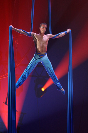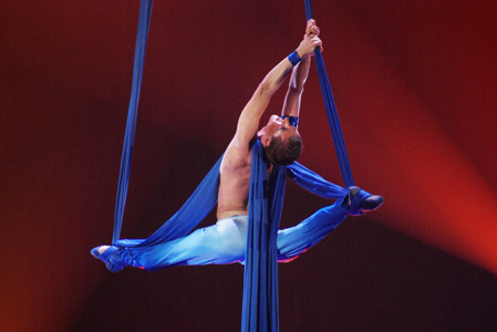 Romain es un famoso artista francés de trapecio aéreo y telas. Su acto aéreo es una mezcla de lo hermoso y lo impresionante. Durante los últimos doce años, Romain ha realizado telas aéreas, una disciplina raramente realizada por un hombre.