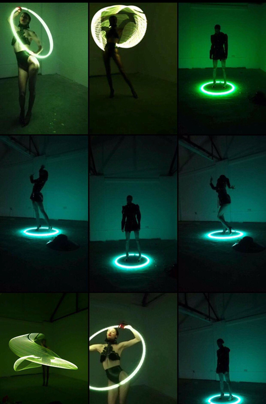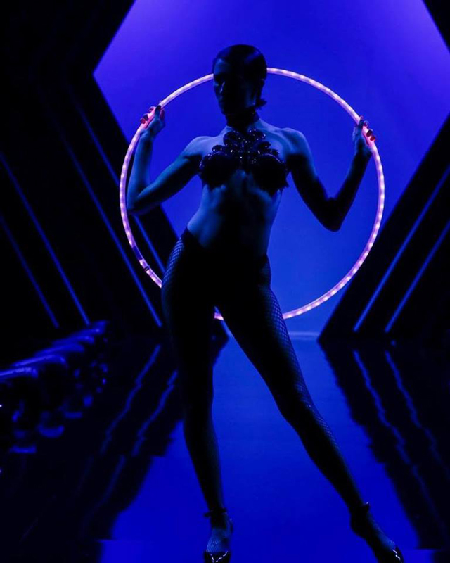 Tomando las pasarelas de los años 90 como inspiración, esta actuación de aro de hula LED totalmente chic transportará a los espectadores a los desfiles de moda más exclusivos de los años 90.