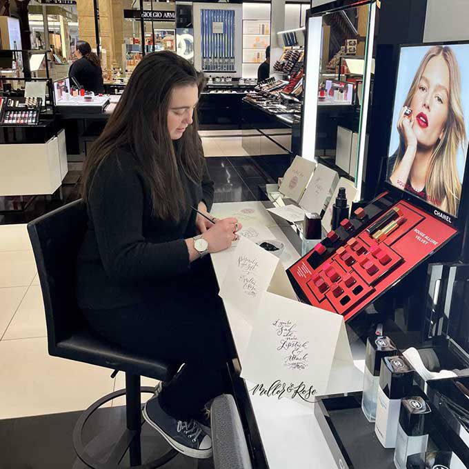 Una de las mejores opciones para campañas en tiendas: caligrafía en tarjetas de regalo y envases, así como grabado en frascos de perfume y productos de belleza