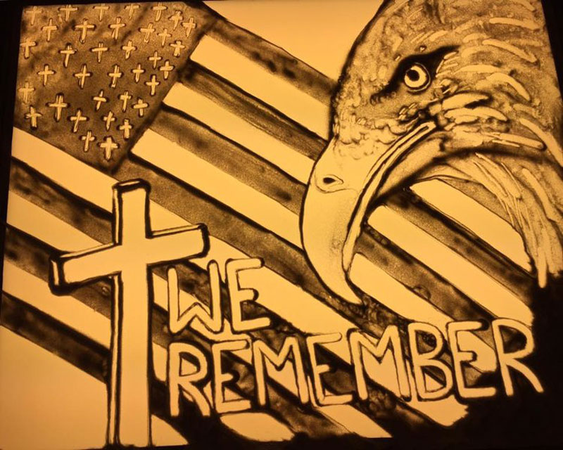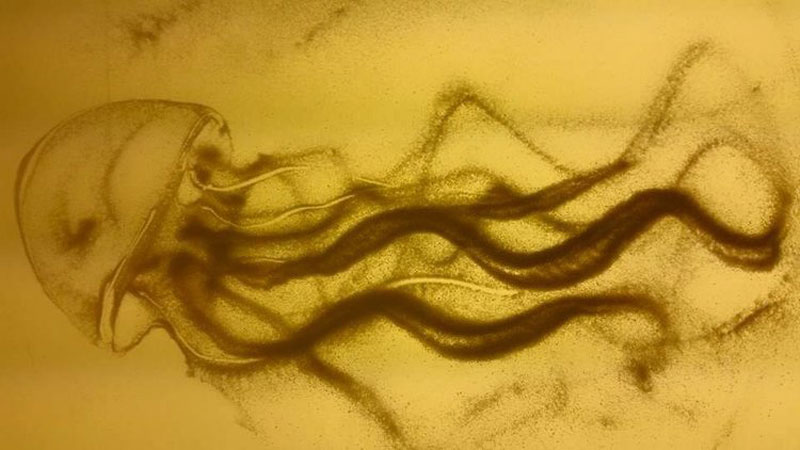 Manipulando sus medios, ella crea imágenes en movimiento manipulando arena con sus manos y dedos.