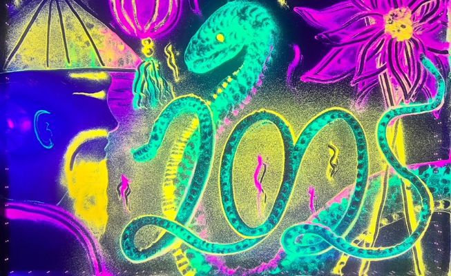 Nuestra modelo y artista impactante trabaja con elementos naturales como el carbón, las semillas y la arena.