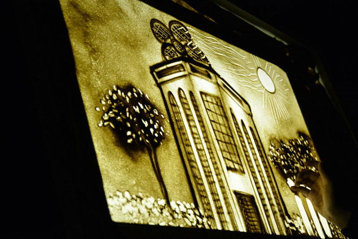 Capaz de adaptar su actuación a los requisitos de su lugar, nuestra artista de arena puede producir animaciones para cualquier tamaño de audiencia utilizando una caja de luz, una cámara y una pantalla.