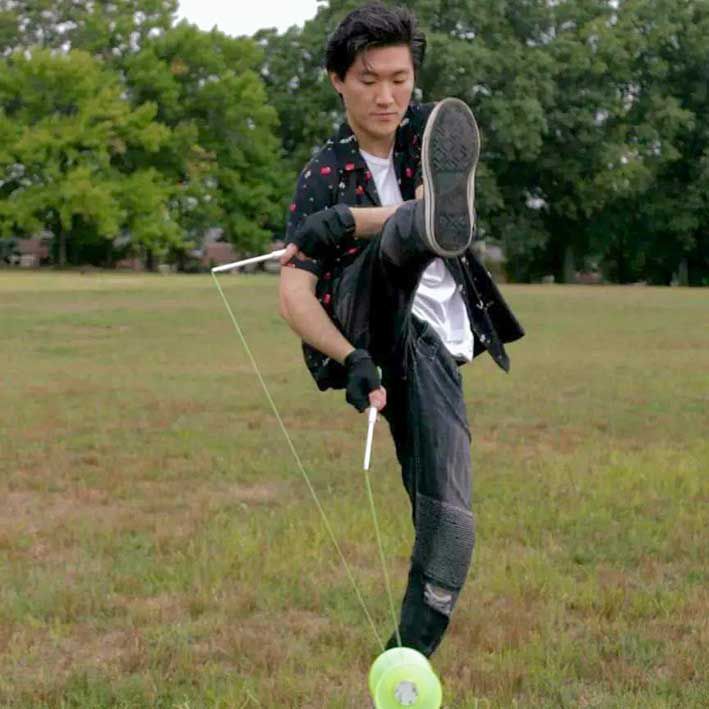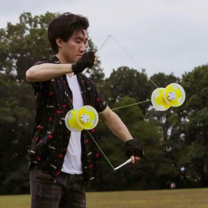 Nuestro experimentado artista de circo es un experto en el yo-yo chino, también conocido como diábolo, que manipula con habilidad coreografiada.