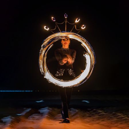 Espera chispas y efectos de iluminación mientras nuestra artista de fuego muestra sus habilidades en una pieza de espectáculo interactivo.