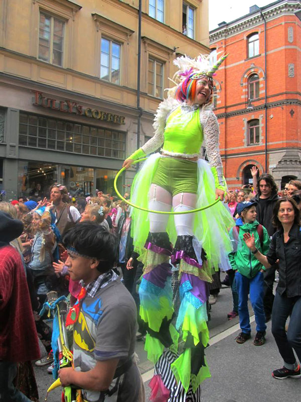 Encaramada en zancos, esta hábil artista también puede ofrecer actuaciones itinerantes. Puede unirse a un desfile o pasear con sus hula hoops interactuando con la gente y posando para fotos. Amada tanto por niños como por adultos, ¡está garantizado que será un éxito instantáneo en cualquier celebración callejera o festival!