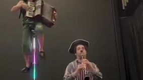 Él combina trucos clásicos de ciclismo con habilidades circenses como malabares con cuchillos e incluso tocar el acordeón mientras se mueve por el espacio.