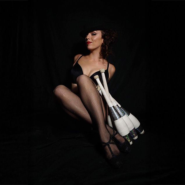Hábilmente malabarea con fuego, cuchillos, sombreros, aros, mazas y pelotas, aportando un toque de espectáculo, habilidad y elegancia a cada evento en el que actúa.