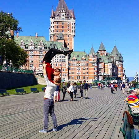 Nuestros dos artistas de circo multi-talentosos pueden realizar acrobacia aérea en correas, equilibrio de manos, cambios rápidos, telas aéreas y rueda Cyr aérea.
