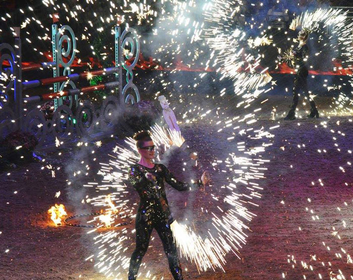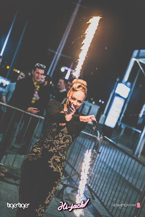 Los artistas de fuego de Londres se inspiran en la glamorosa era de los años 1920 con un toque de El Gran Gatsby y ofrecen impresionantes espectáculos de fuego vestidos con elegantes trajes de lentejuelas negras y doradas o azules y plateadas, y flores doradas en su cabello. Coreografían elegantes espectáculos de fuego al ritmo de enérgicas canciones de swing como "Sing Sing Sing" de Benny Goodman.