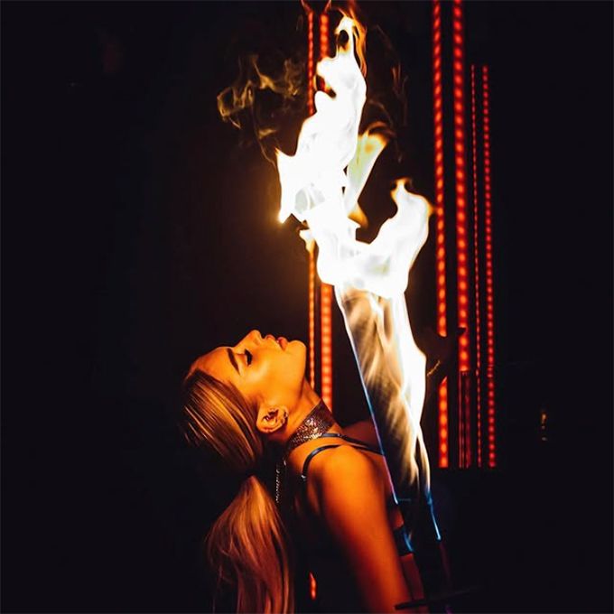 Una emocionante mezcla de arte y peligro, con técnica impecable y una presencia escénica cautivadora; esta bailarina de fuego pone intensidad a los eventos