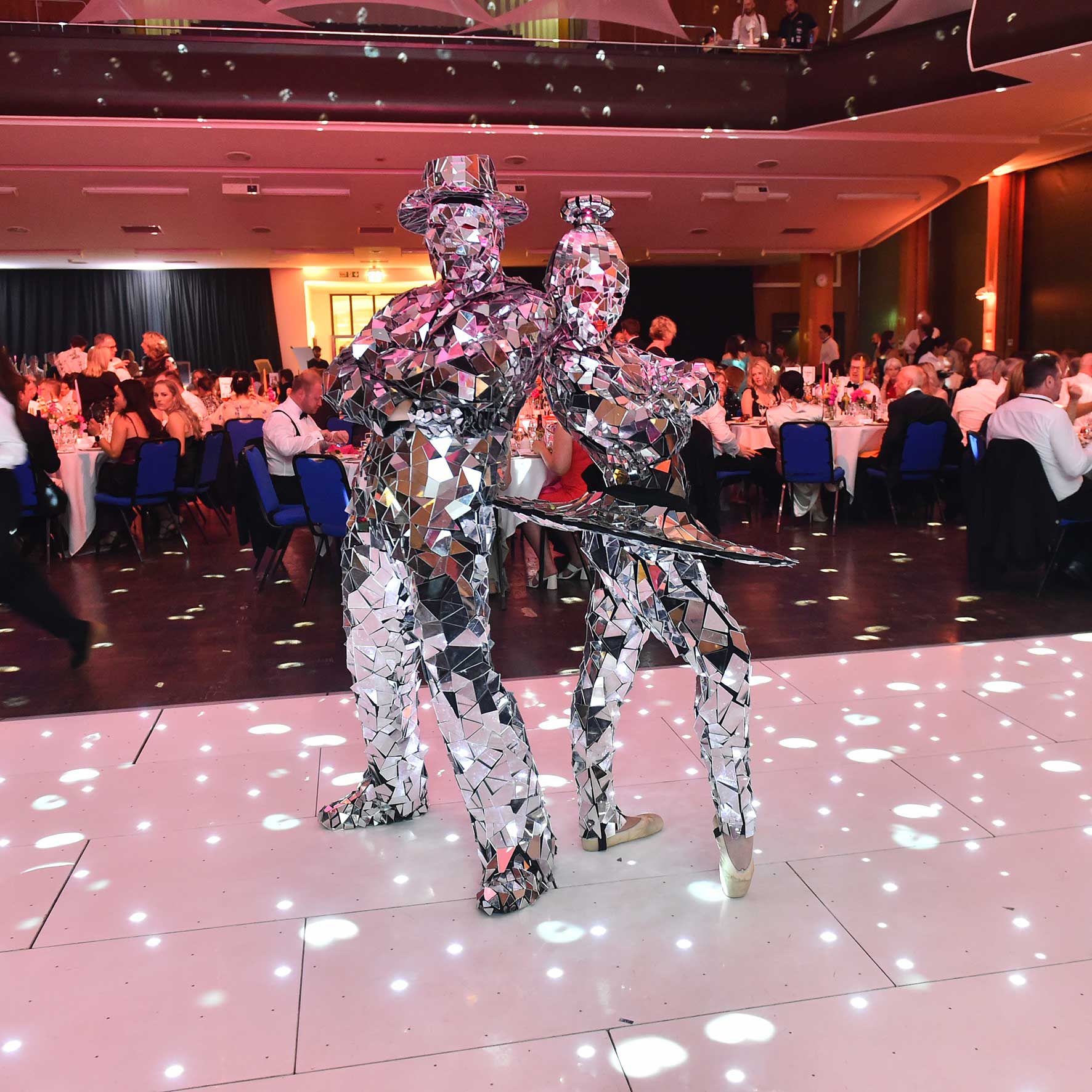 Una opción llamativa para recepciones y eventos de mezcla y mingling, nuestras brillantes y elegantes bailarinas de bola de espejo están disponibles para eventos en todo el mundo.