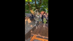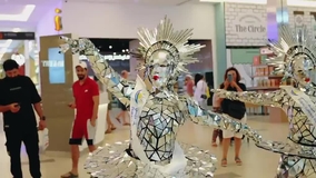 Vestidos de pies a cabeza con un patrón de mosaico de espejos, estos elegantes artistas reflejan la luz y el ambiente de la habitación que los rodea.