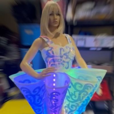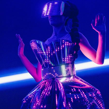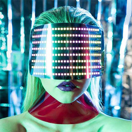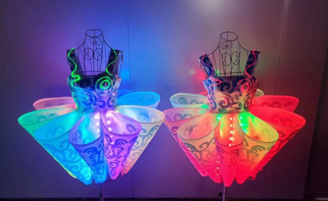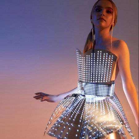 Totalmente programables, los vestidos y las gafas pueden sincronizarse con la música, mostrar colores específicos e incluso mostrar texto simple y logotipos.