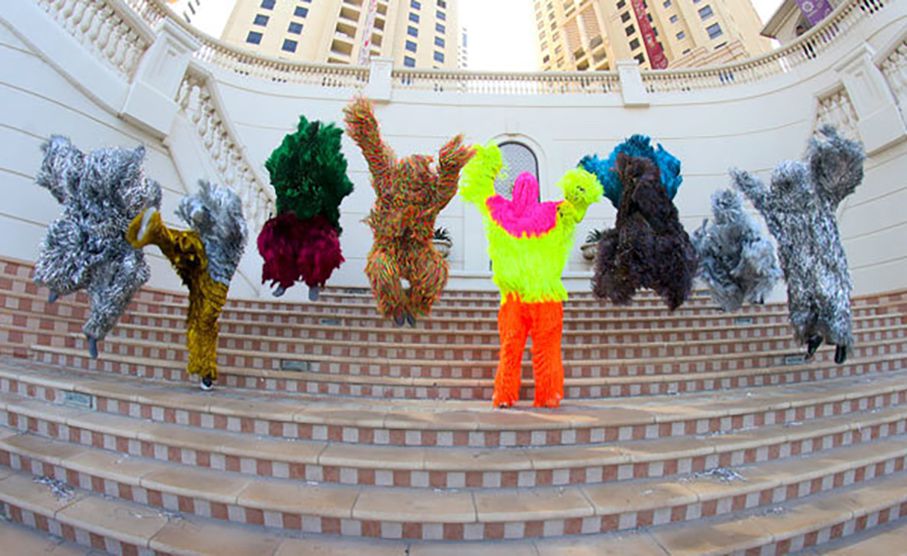 Disponibles en una variedad de colores, estos disfraces imaginativos son como pompones vivientes que brillan y resplandecen mientras se mueven por el lugar.
