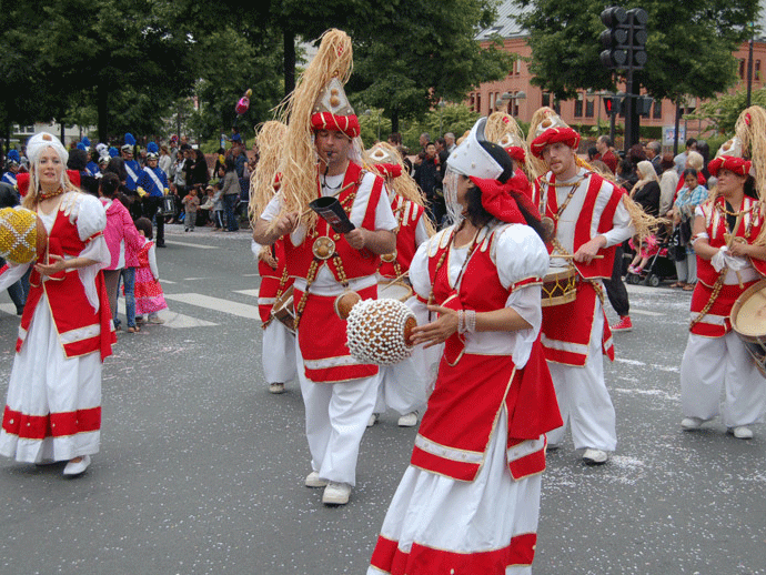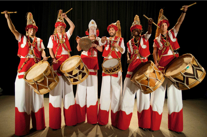 Esta enérgica banda interpreta Maracatu, música tradicional de Brasil del noreste de Brasil. Ritmos contagiosos, hermosas melodías y auténticos trajes transportarán a la audiencia en un viaje musical a lo largo de la costa brasileña.