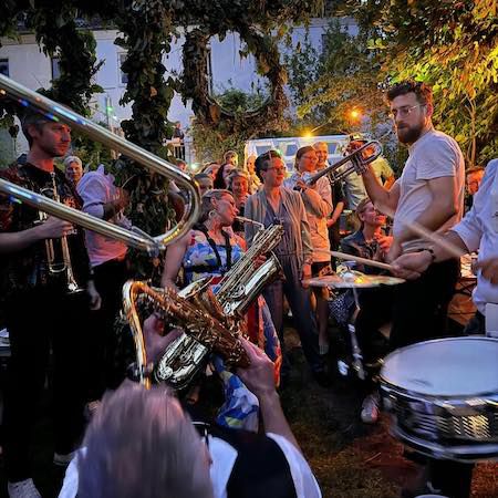 ¡Nueva Orleans se encuentra con Berlín! Esta animada banda de vientos ofrece música callejera de alta energía que levanta el ánimo y pone a la gente a bailar.