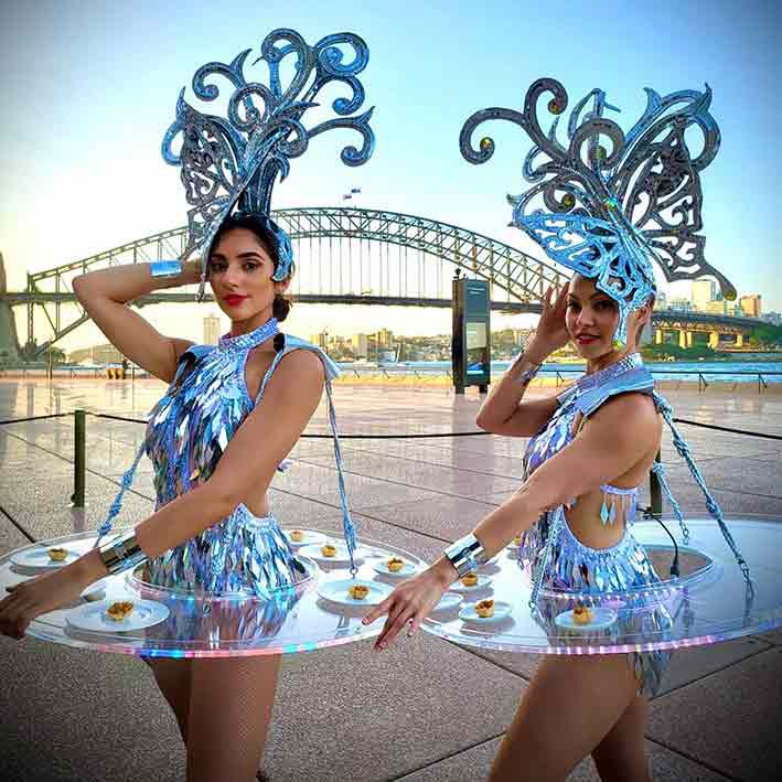 Bandejas sujetas al cuerpo del intérprete y iluminadas con LEDs de colores cambiantes ofrecen una forma única de servir comida y bebidas a tus invitados.