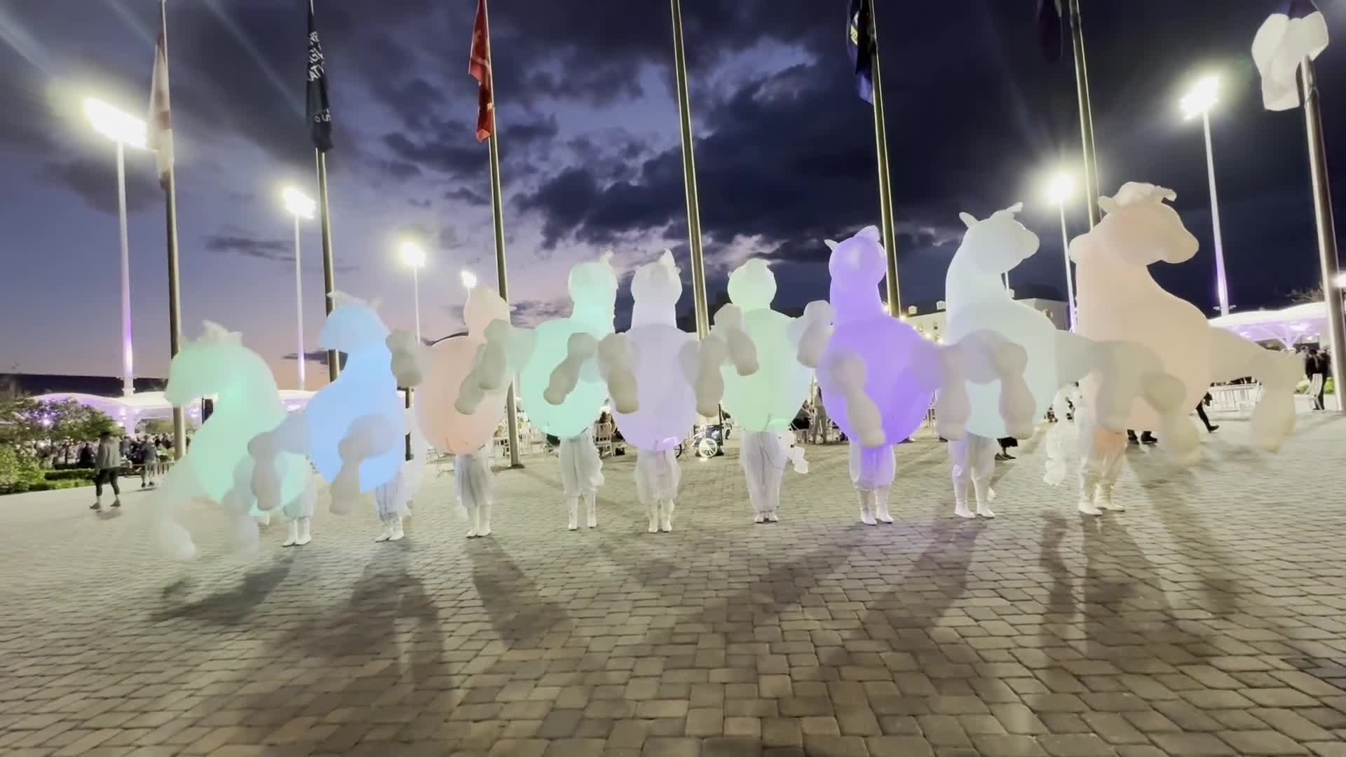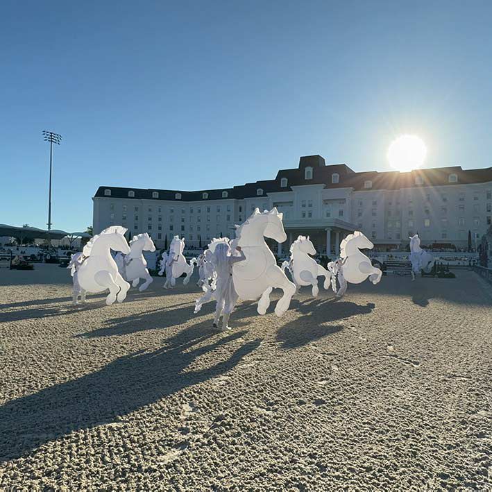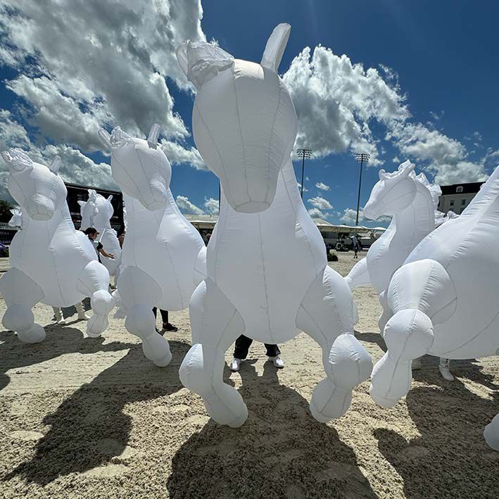 Nuestra cabalgata de caballos consta de hasta 20 marionetas LED hinchables, unidas a artistas que pueden realizar actuaciones coreografiadas, ambientaciones y sesiones fotográficas.