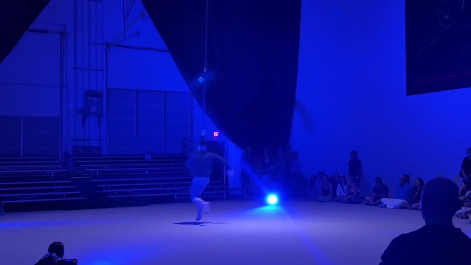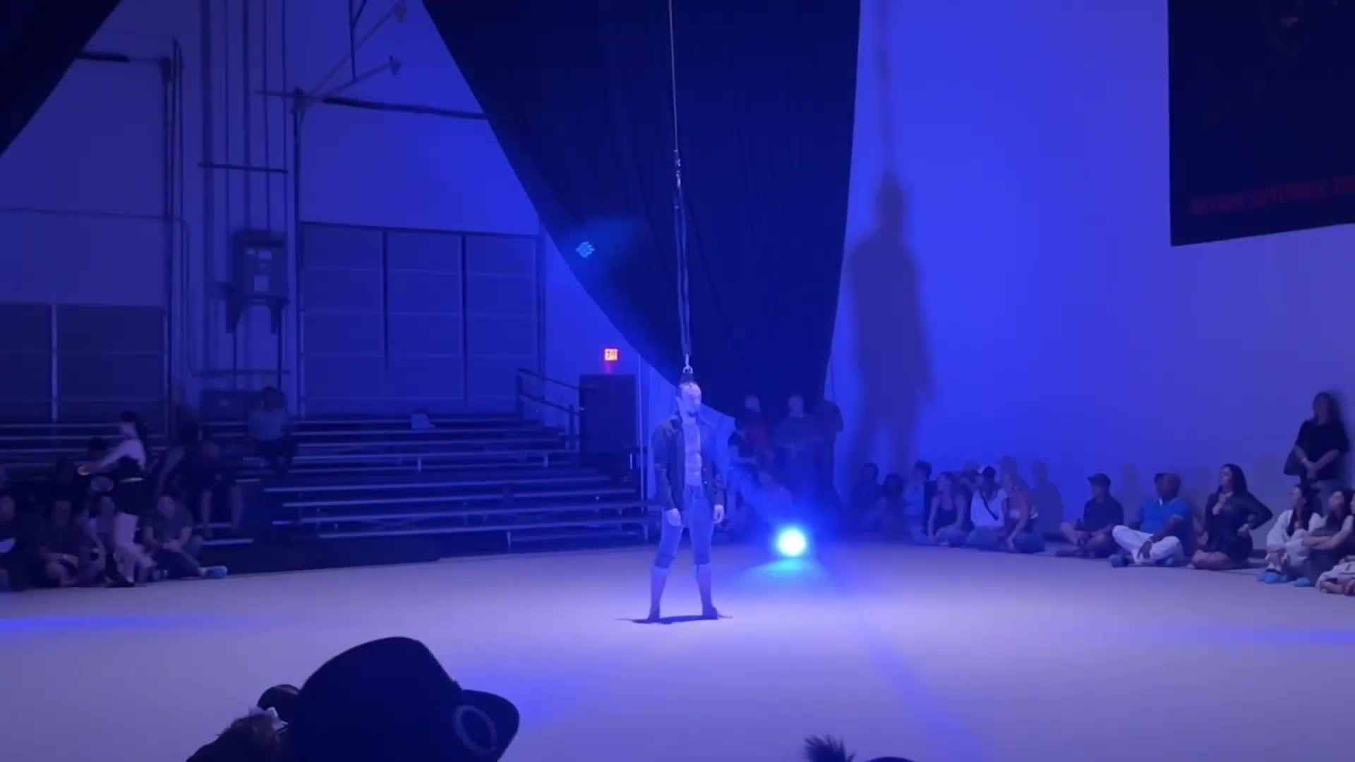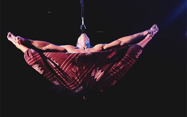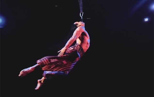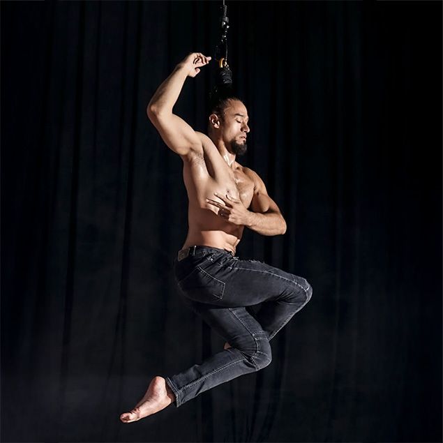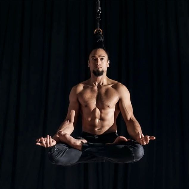 Él crea formas fascinantes y giros poderosos muy por encima del suelo, suspendido solo por su cabello, dejando al público atónito y maravillado.