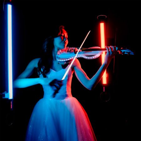 Este violinista LED mezcla sonidos clásicos con pistas modernas para crear una experiencia musical única, fusionando tendencias pasadas y presentes.