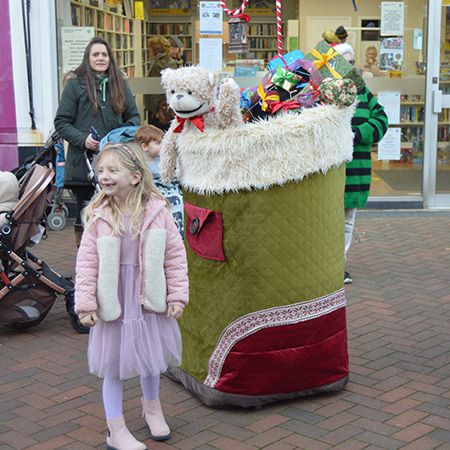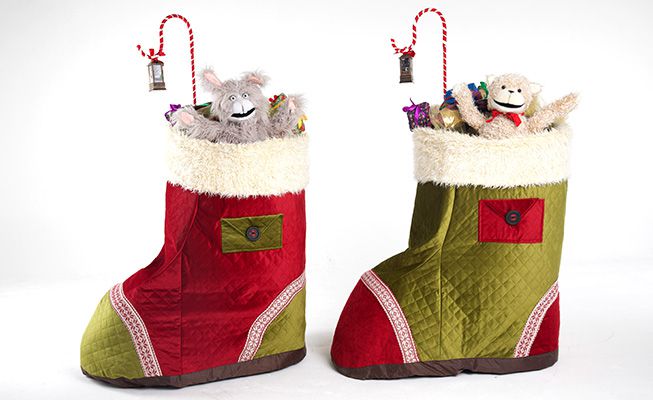 Lleno de regalos gigantes, nuestro calcetín extragrande se paseará mágicamente por el espacio de tu evento dirigido por dos peluches animados e interactivos