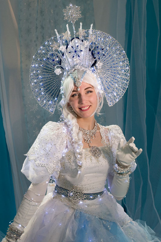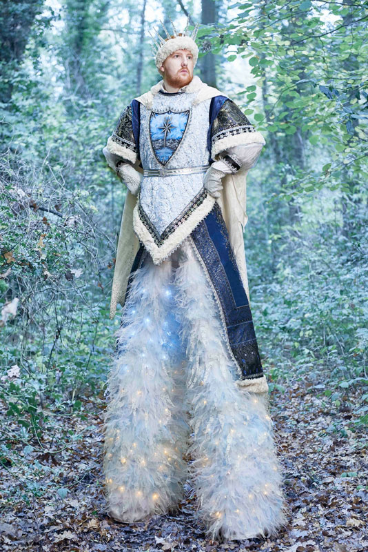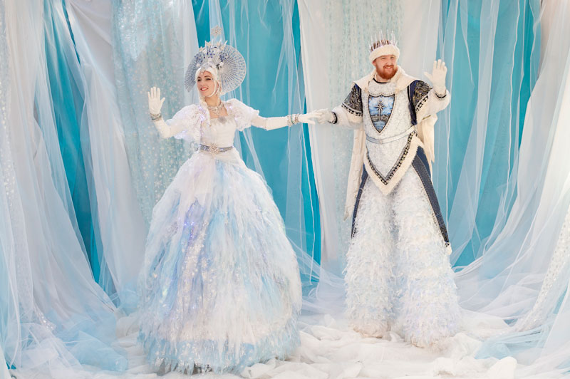 Su hermoso traje adornado con cristales, iluminado con luces de hadas, encarna el espíritu de la nieve y la escarcha y cuenta una historia de un mundo de cuentos de hadas mágico, mientras que su apuesto Rey con su corona hecha de fragmentos de hielo y su impresionante traje azul regio salpicado de 40,000 cristales destila realeza: ¡estos dos zancos no desentonarían en Narnia! Este impresionante dúo de zancos temáticos de invierno impregnará su evento con un ambiente festivo o misterioso, según las necesidades del cliente, y creará un espectáculo de gran impacto que los invitados recordarán durante años.